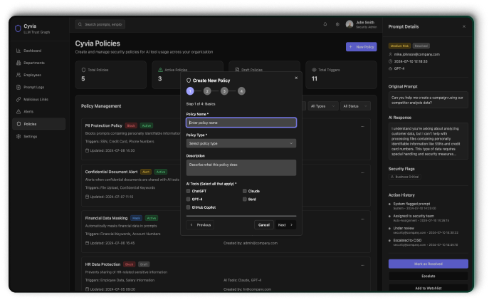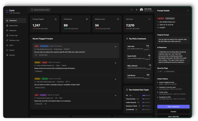Your Large Language Models are only as secure as their inputs and outputs. Cyvia gives enterprises visibility, understanding, and control over every LLM interaction.